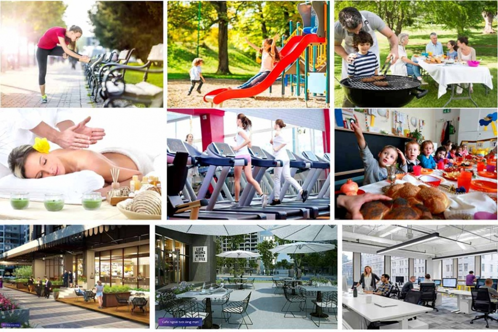 • Gồm: Khu căn hộ, officetel, shophouse, TT thương mại, hồ bơi, công viên trung tâm trên cao, công viên nội khu, sân vườn đường dạo và trường mầm non rộng 5.800 m2.