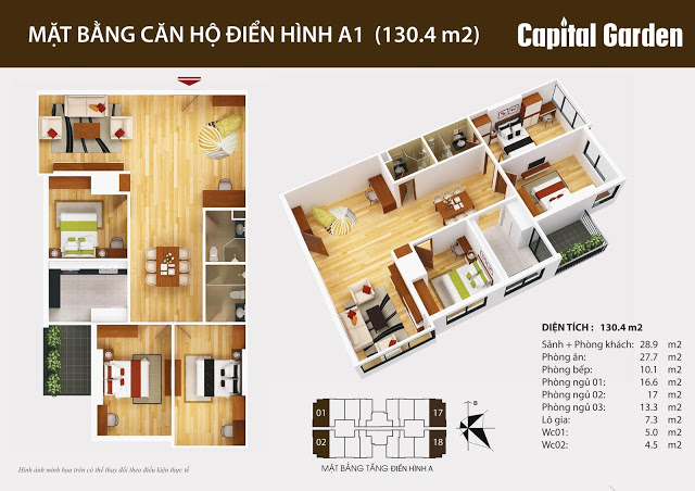 Diện tích: 130m2. Ban công: Hướng bắc, 3 phòng ngủ, 2 vệ sinh. Giá 33tr/m2, đã bao gồm nội thất cao cấp: Sàn gỗ nhập khẩu Đức, thiết bị vệ sinh Toto, Bình nóng lạnh Ferroly 30l, khóa cửa sử dụng thẻ từ Hàn Quốc... ).