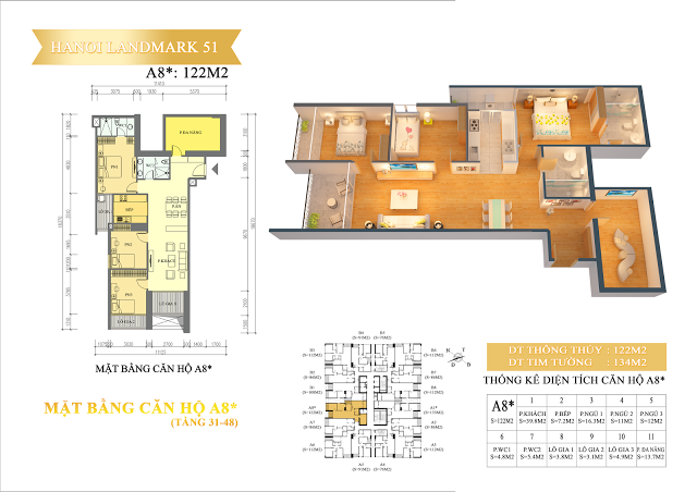 * Các căn 3 phòng ngủ tại Chung cư Hanoi Land Mark 51 gồm các loại diện tích: 91m2 đến 133m2