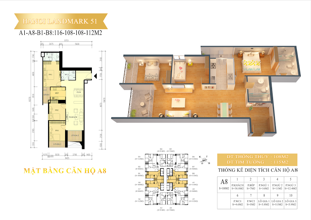 + Loại 3 phòng ngủ (3PN) gồm các loại diện tích: 91m2, 112m2, 108m2, 116m2