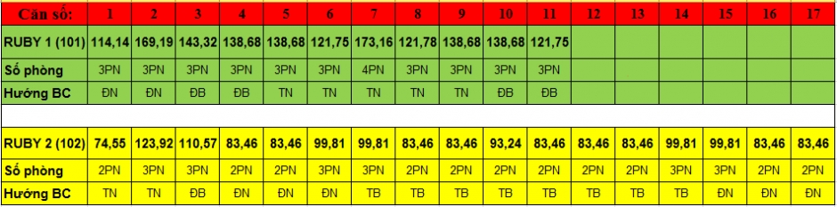 - Căn 04,05,16,17 RUBY 2 diện tích 78m ban công Đông Nam, 2PN nhìn quảng trường .