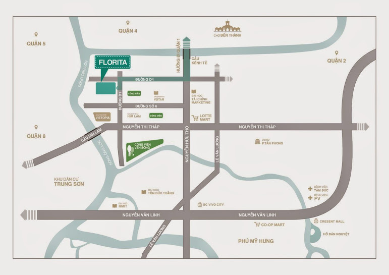 - Căn hộ Florita dễ dàng kết nối đến các quận 1, 4, 7, 8, Huyện Nhà Bè, Bình Chánh và đặc biệt chỉ cách chợ Bến Thành chưa đầy 10 phút xe máy.