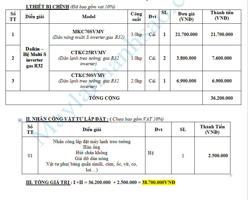 - Giá máy đã bao gồm VAT 10% . Nhân công vật tư chưa VAT